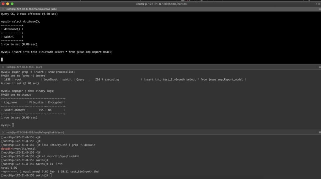 3rd screen : You can see the individual table-space file ( .ibd ) keep growing ( 5.6 GB ) on executing state .