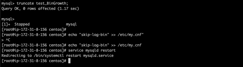 After this testing, I have truncated the table and restarted the MySQL with skip-log-bin .