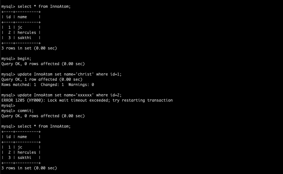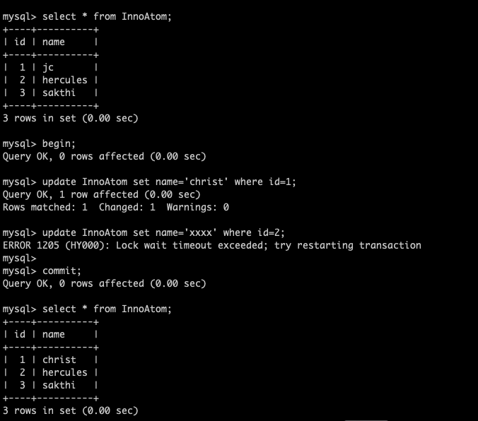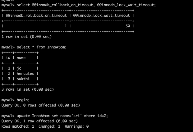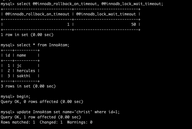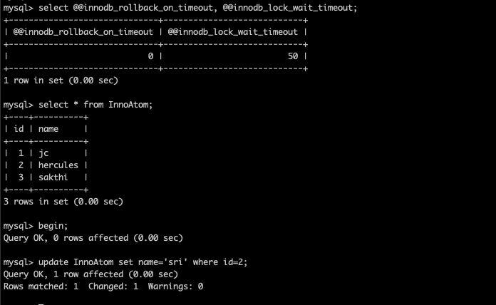 With innodb_rollback_on_timeout = ON , Both the statements were not committed and the complete transaction has rolled back . THE ENTIRE TRANSACTION HAS ROLLBACK . So, this is the exact Atomicity right ?