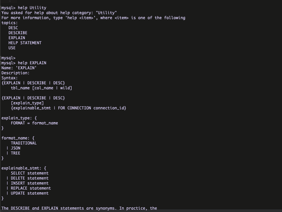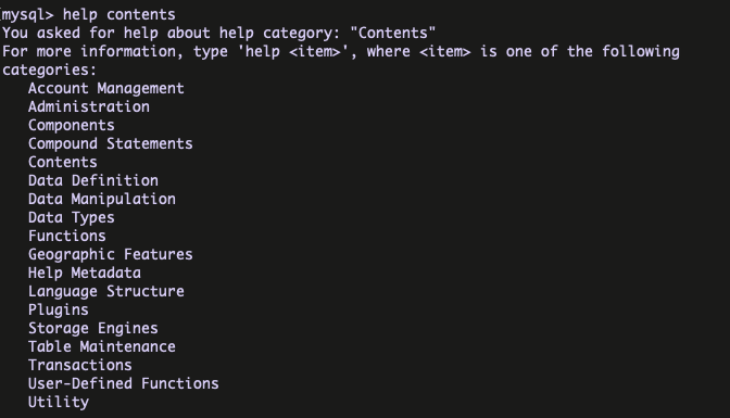 MySQL client program provides the help command with the option contents for the learning purpose . This is very helpful for learning the MySQL commands ( like Manual ) .