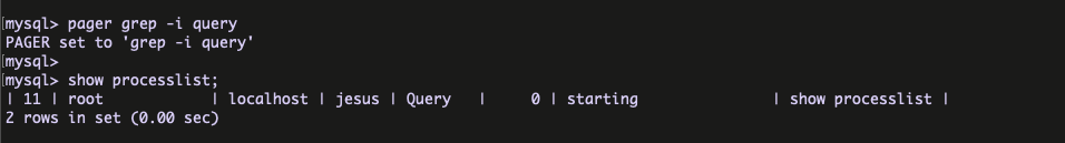 The most common usage of pager is to set it to a Unix pager such as MORE,LESS,CAT . The below blog have the nice examples about the MySQL pager command .