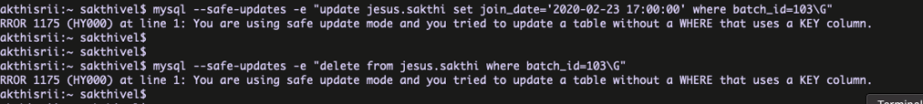 Here the column batch_id don’t have the INDEX . Now, I am going to enable the ” –safe-updates ” and perform the UPDATE/DELETE based on the column batch_id=103 ( which don’t have index ).